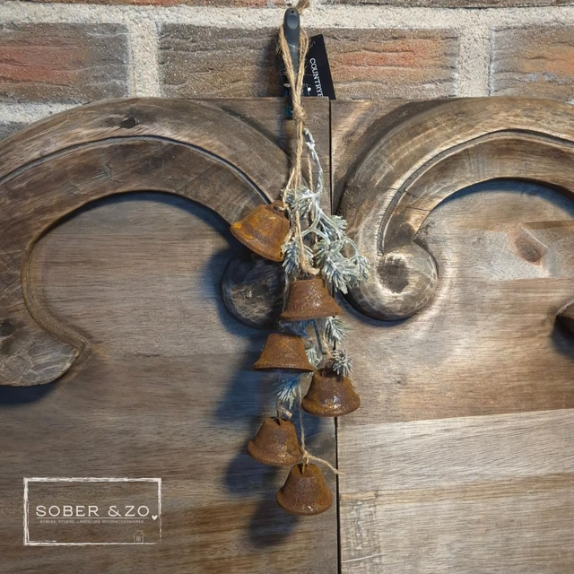 Leuke roest belletjes aan een touw met een takje groen. Countryfield.