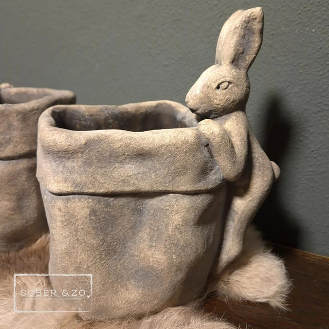 Super leuk bakje/potje van beton met een haasje die over de rand gluurt.