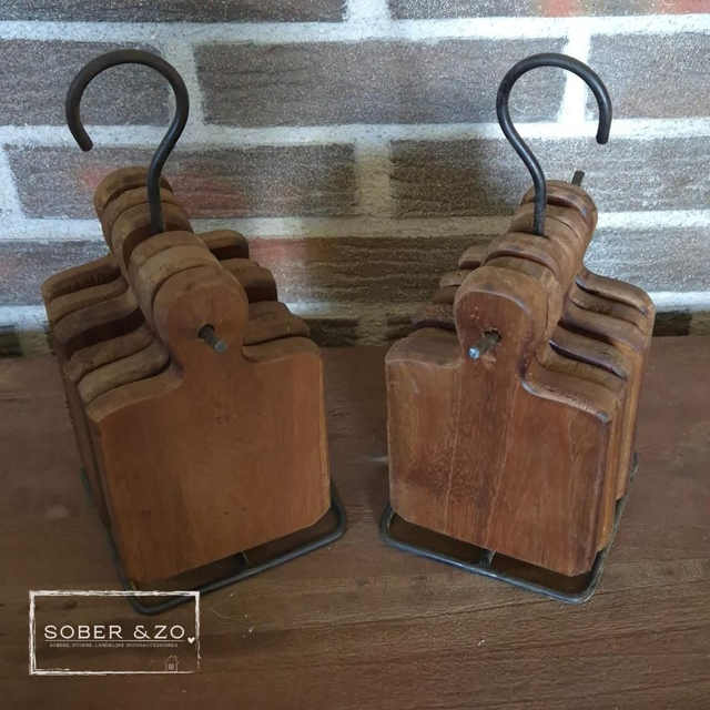 Houten onderzetters aan een metalen rekje. Setje van 6 onderzetters.
