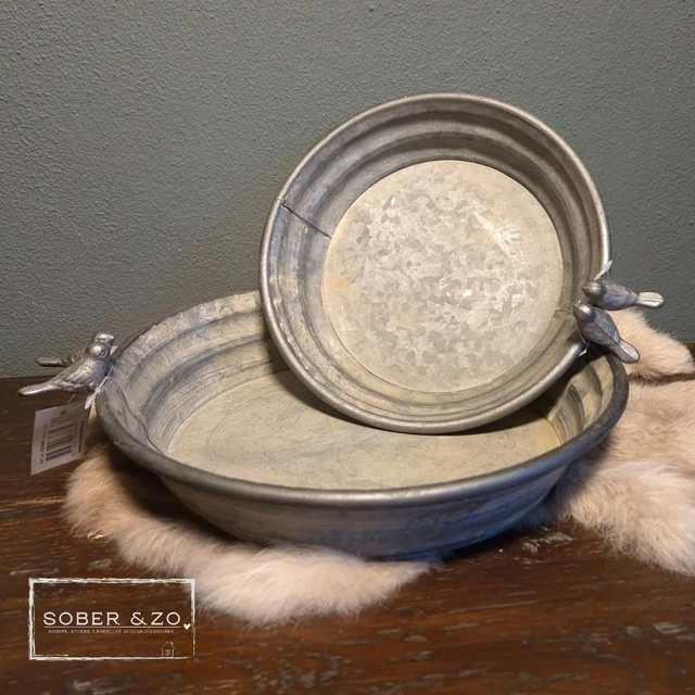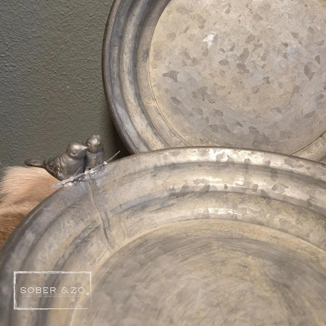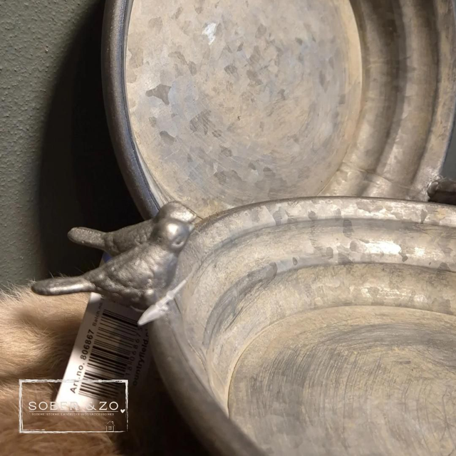 Mooi metalen vogelvoederbakje met 2 vogeltjes zittend op de rand. Countryfield.