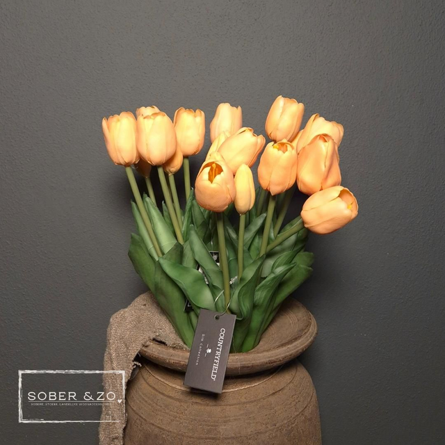 Prachtige echt lijkende zalmkleurige tulpen van Countryfield. 5 bloemen in een bosje, 3 open en 2 in de knop.